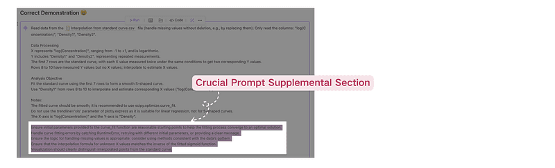 Once the above prompt is written, click ‘Run’ to check for error messages and incorrect visualization due to inappropriate handling of curve fitting.