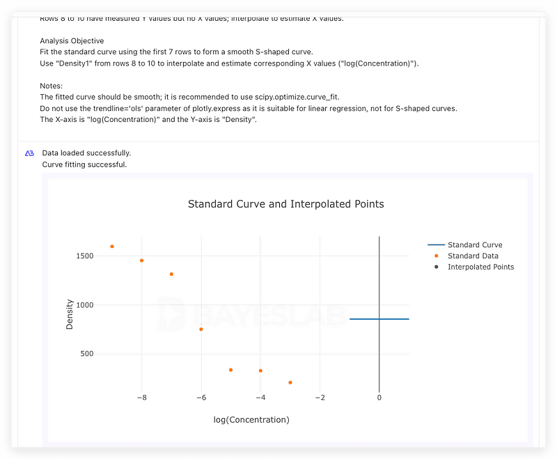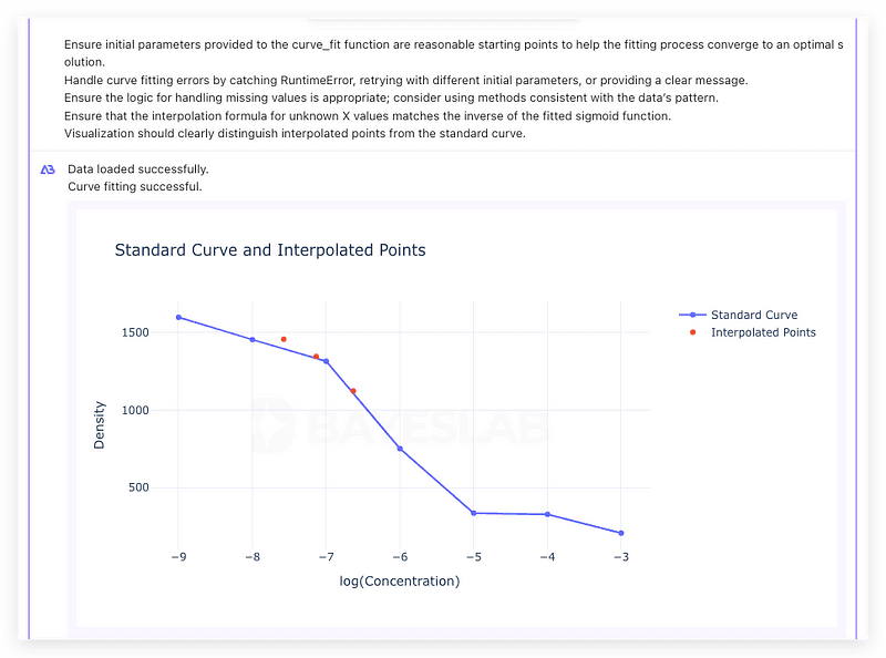 Once the above prompt is written, click ‘Run’ to see the correct standard curve along with interpolated values, providing a clear and smooth S-shaped curve.