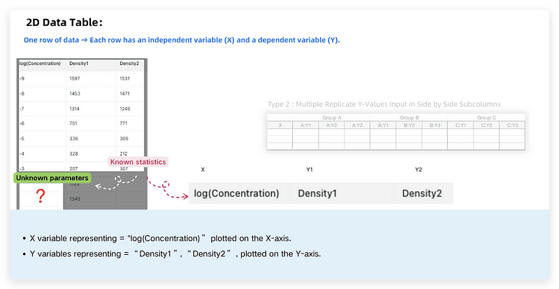 We’ll start with a data table featuring columns “log(Concentration)”, “Density1”, and “Density2”.The chart helps illustrate the relationship between concentration and density over a range of values by fitting an S-shaped curve.