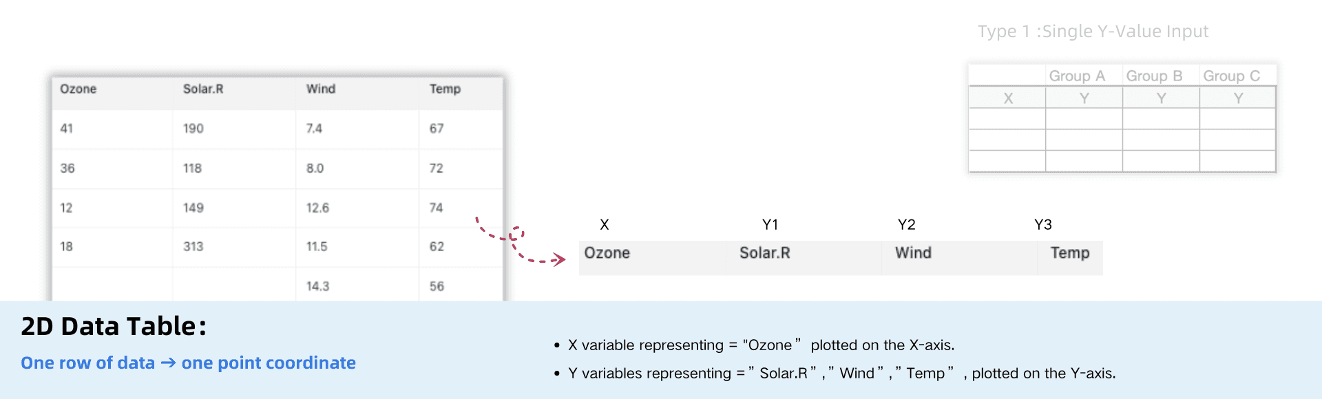 There are two main types of 2D data tables: One for Single Y-Value ,and the other for Multiple Replicate Y-Values