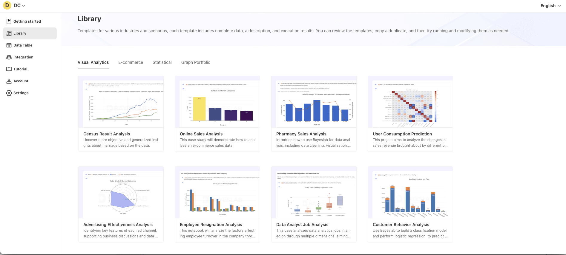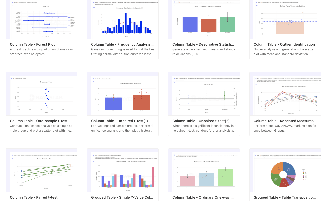 For various data source table structures, the Bayeslab library contains visualization and statistical analysis methods that can be used.: https://editor.bayeslab.ai/library
