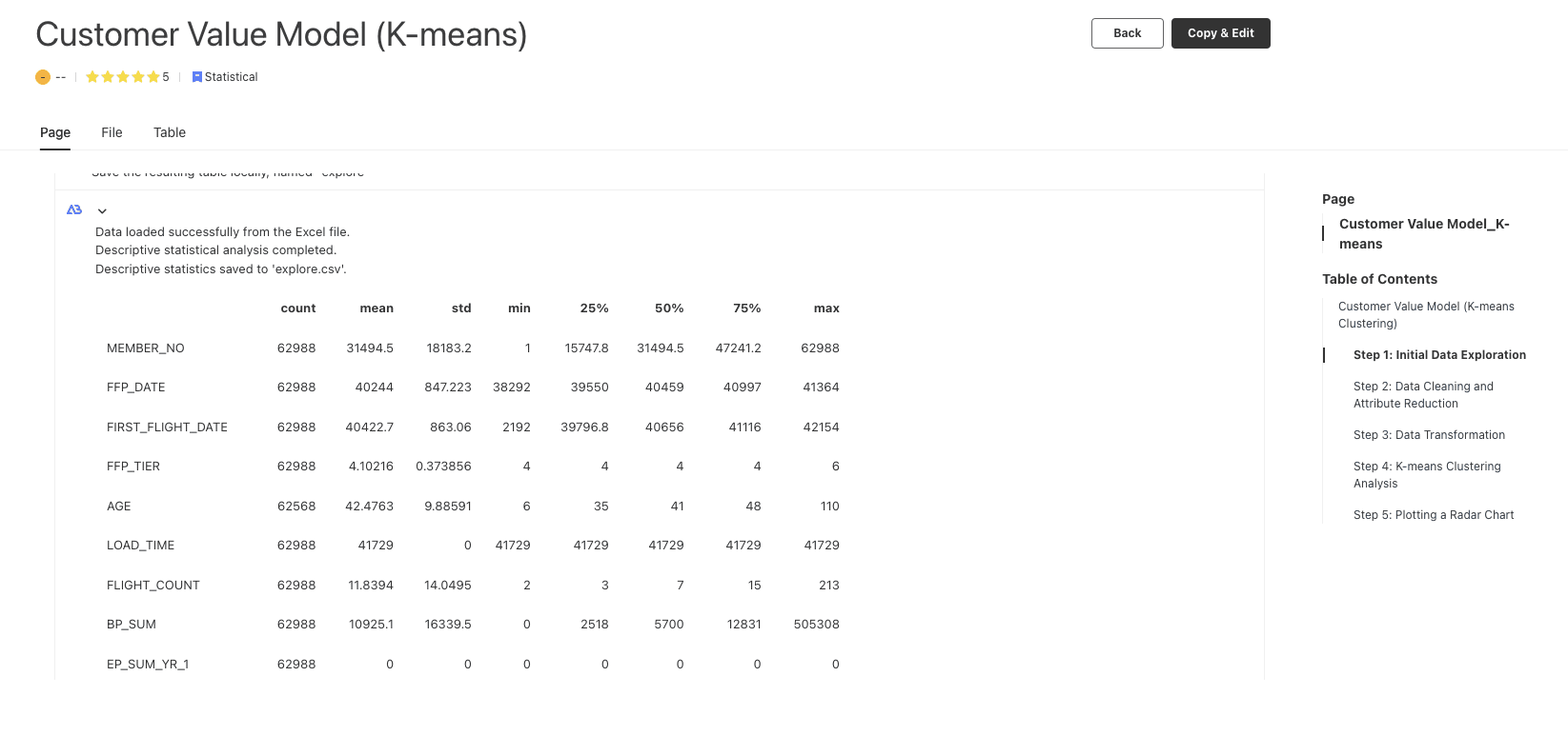 An example of statistical description can be seen in the data exploration steps within this template: https://editor.bayeslab.ai/libraryDetail?tid=28fec9ca-a40f-44c0-be1c-e2be23c07114