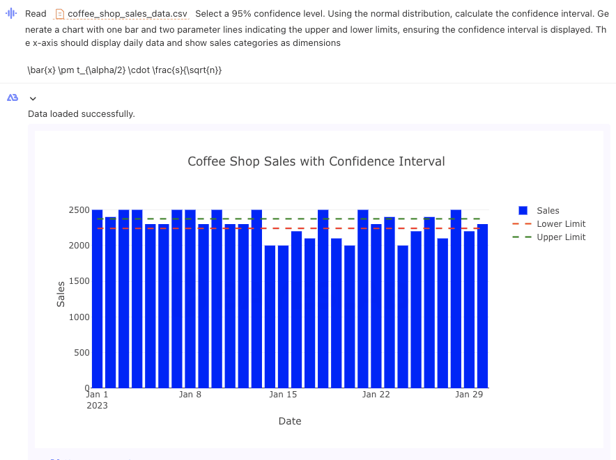 ▶︎ Interval Estimate: At a 95% confidence level, the average daily sales of the coffee shop are likely to be between $2239.49 and $2373.85.