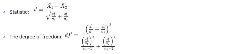 Previously in t-test, we noted that when the population variance is unknown, the choice of test statistics and the calculation of degrees of freedom vary significantly depending on variance homogeneity. For more details, refer to the historical template discussed earlier, summarized as follows: