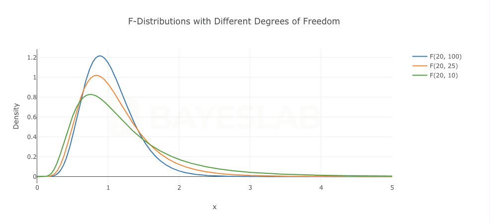 As ( df₁ ) and ( df₂ ) increase, the skewness of the curve decreases, but it does not approach the limit form of a normal distribution.